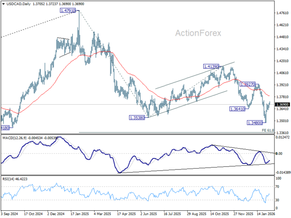 Intraday bias in USD/CAD is back on the upside as rebound from 1.3480 is resuming for 55 D EMA (now at 1.3788). Strong resistance could be seen there to complete the corrective bounce. On the downside, below 1.3625 support will bring retest of 1.3480 low. Firm break there will resume larger fall to 61.8% projection of 1.4791 to 1.3538 from 1.4139 at 1.3365. However, sustained trading above 55 D EMA will raise the chance of near term bullish reversal, and target 1.3927 resistance for confirmation.
