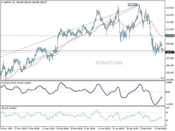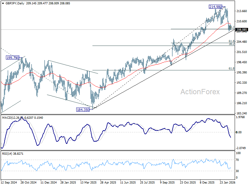 Outlook in GBP/JPY is unchanged. Intraday bias stays neutral with immediate focus on 38.2% retracement of 197.47 to 214.98 at 208.29. Sustained break of 208.29 will suggest that larger scale correction is already underway and target 203.27 fibonacci level. Nevertheless, strong rebound from current level, followed by break of 210.47 minor resistance will retain near term bullishness, and bring retest of 214.83/98 resistance zone.