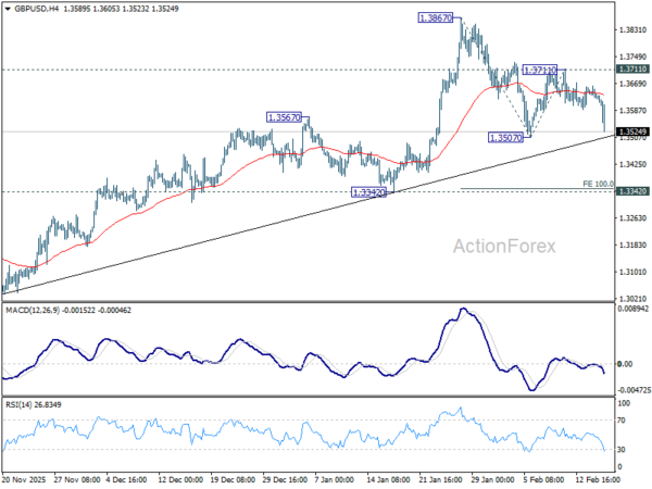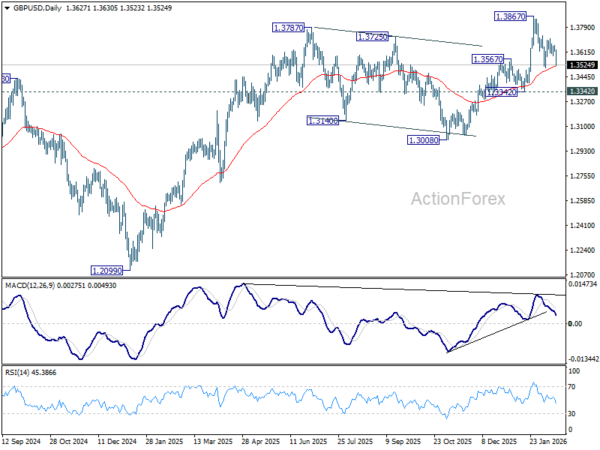 Immediate focus is now on 1.3507 support in GBP/USD with today’s downside acceleration. Firm break there and sustained trading below 55 D EMA (now at 1.3518) will raise the chance of larger scale correction. Deeper fall should then be seen to 1.3342 support for confirmation. On the upside, break of 1.3711 will bring retest of 1.3867 high.