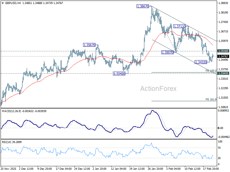 A temporary low is in place at 1.3432 in GBP/USD with 4H MACD crossed above signal line. Intraday bias is turned neutral for consolidations. But risk will stay on the downside as long as 1.3711 resistance holds. Below 1.3432 will target 1.3342 support next. Current development suggests that the decline is at least correcting the uptrend from 1.2099. Break of 1.3342 support will solidify this case, and target 161.8% projection of 1.3867 to 1.3507 from 1.3711 at 1.3129.