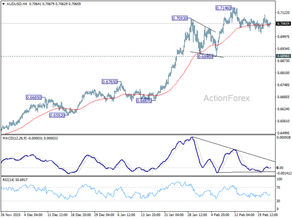 Currency markets reflect a mild risk-off tilt. Sterling leads gains, followed by Dollar and Swiss Franc. Australian Dollar is the weakest, trailed by Kiwi and Loonie, while Yen and Euro sit mid-pack. Yet price action lacks follow-through. Major pairs and crosses remain bounded within last week’s ranges, signaling hesitation rather than decisive repositioning. Traders appear reluctant to commit ahead of Trump’s upcoming State of the Union address today, which could clarify what’s next regarding tariffs.