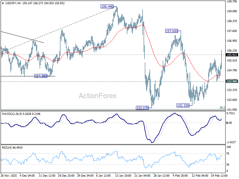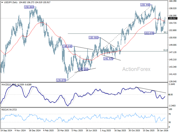 Technically, USD/JPY’s sharp jump reinforces the view that recent price action from 159.44 represents a near term sideway consolidation pattern only. The broader uptrend from the 139.87 low in 2025 remains intact, suggesting eventual resumption toward and potentially beyond 159.44 . But then risk of intervention will surge as USD/JPY marches on.