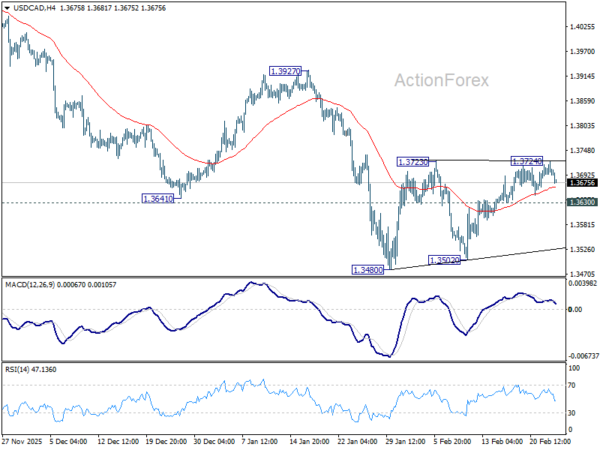 USD/CAD edged higher to 1.3724 but quickly retreated. Intraday bias stays neutral for the moment. Consolidations from 1.3480 is in progress and stronger rebound might be seen. But upside should be limited by 55 D EMA (now at 1.3733) to complete the pattern. On the downside, below 1.3630 minor support will bring retest of 1.3480 low. Firm break there will resume larger down trend from 1.4791 to 61.8% projection of 1.4791 to 1.3538 from 1.4139 at 1.3365. However, sustained break of 55 D EMA will bring further rise to 1.3927 resistance and above.