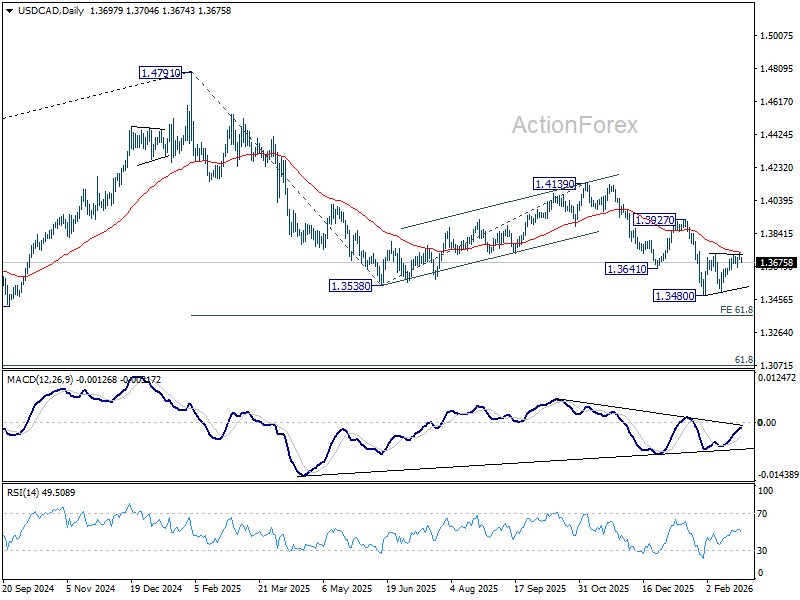 USD/CAD edged higher to 1.3724 but quickly retreated. Intraday bias stays neutral for the moment. Consolidations from 1.3480 is in progress and stronger rebound might be seen. But upside should be limited by 55 D EMA (now at 1.3733) to complete the pattern. On the downside, below 1.3630 minor support will bring retest of 1.3480 low. Firm break there will resume larger down trend from 1.4791 to 61.8% projection of 1.4791 to 1.3538 from 1.4139 at 1.3365. However, sustained break of 55 D EMA will bring further rise to 1.3927 resistance and above.