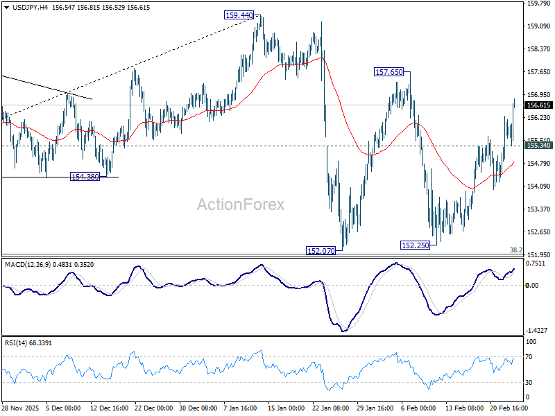 Intraday bias in USD/JPY stays on the upside as rise form 152.25 extends higher today. Firm break of 157.65 resistance will target a retest on 159.44 high. On the downside, below 155.34 minor support will turn intraday bias neutral again first. Overall, with 38.2% retracement of 139.87 to 159.44 at 151.96 intact, price actions from 159.44 are seen as a corrective pattern. Also, rise from 139.87 is expected to resume through 159.44 at a later stage.