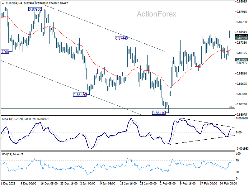 EUR/GBP’s rebound from 0.8611 is resuming and intraday bias is back on the upside. Sustained trading above 0.8744 resistance will solidify the case that fall from 0.8863 has completed as a correction at 0.8661. Further rise should then be seen back to retest 0.8663 high. On the downside, below 0.8705 support will turn intraday bias neutral again first. But near term outlook will stay bullish as long as 38.2% retracement of 0.8221 to 0.8663 at 0.8618 holds.