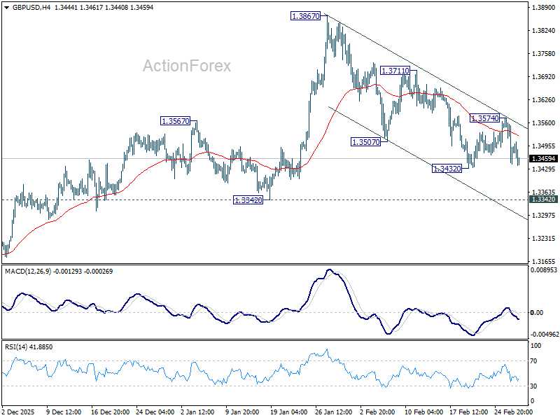 GBP/USD is still holding above 1.3432 support and intraday bias remains neutral for the moment. On the downside, below 1.3432 will resume the fall from 1.3867 to 1.3342 support. Firm break there should confirm that it’s already correcting the whole rise from 1.2099. However, break of 1.3574 resistance will argue that the decline has completed as a near term correction, and turn bias back to the upside for retesting 1.3867.