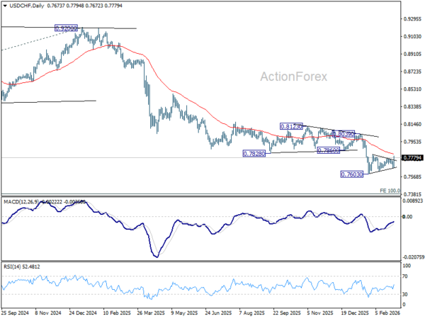 USD/CHF jumps sharply today, but upside is still limited below 0.7816 resistance, as well as 55 D EMA (now at 0.7818). Intraday bias stays neutral first, and further decline is till expected. Below 0.7671 will bring retest of 0.7603 low. Firm break there will resume larger down trend, and target 0.7382 projection level next. However, sustained break of 55 D EMA will indicate that a larger scale corrective bounce in underway and target 0.8039 resistance next.
