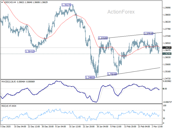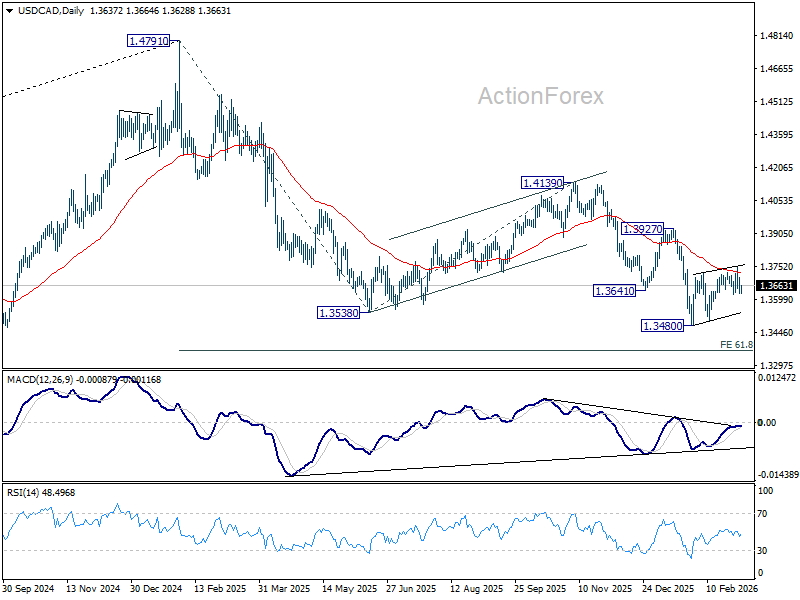 Intraday bias in USD/CAD remains neutral for the moment, and outlook is unchanged. Strong resistance is still expected from 55 D EMA (now at 1.3721) to limit upside to complete the consolidation pattern from 1.3480. Below 1.3624 minor support will bring retest of 1.3480 low first. However, decisive break of 55 D EMA will bring stronger rebound to 1.3927 resistance instead.
