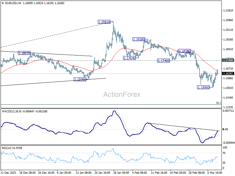 EUR/USD’s recovery from 1.1506 continues today, but stays well below 1.1740 support turned resistance. Intraday bias remains neutral, and further decline is still expected. Break of 1.1506 will resume the fall from 1.2081 and target 38.2% retracement of 1.0176 to 1.2081 at 1.1353 next.