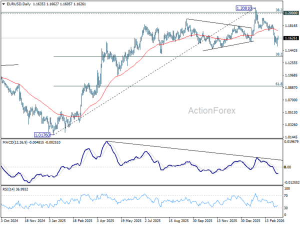 In the bigger picture, a medium term top should be in place at 1.2081 on bearish divergence condition in D MACD. Sustained trading below 55 W EMA (now at 1.1500) should confirm rejection by 1.2 key cluster resistance level. That would also raise the chance that whole up trend from 0.9534 (2022 low) has completed as a three wave corrective bounce too. For now, medium term outlook is neutral at best as long as 1.2081 holds, even in case of rebound.