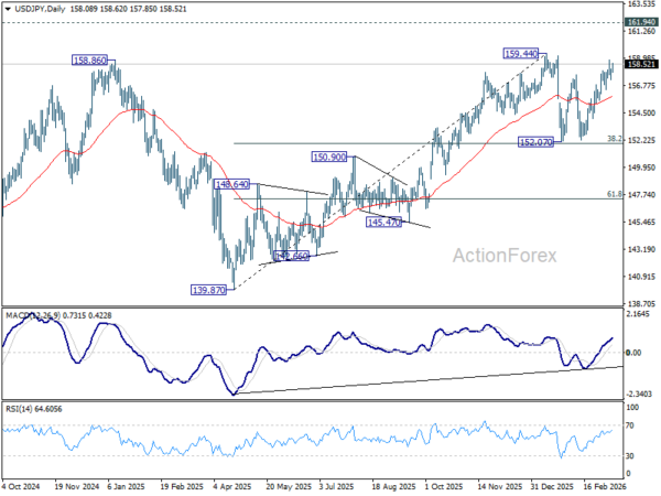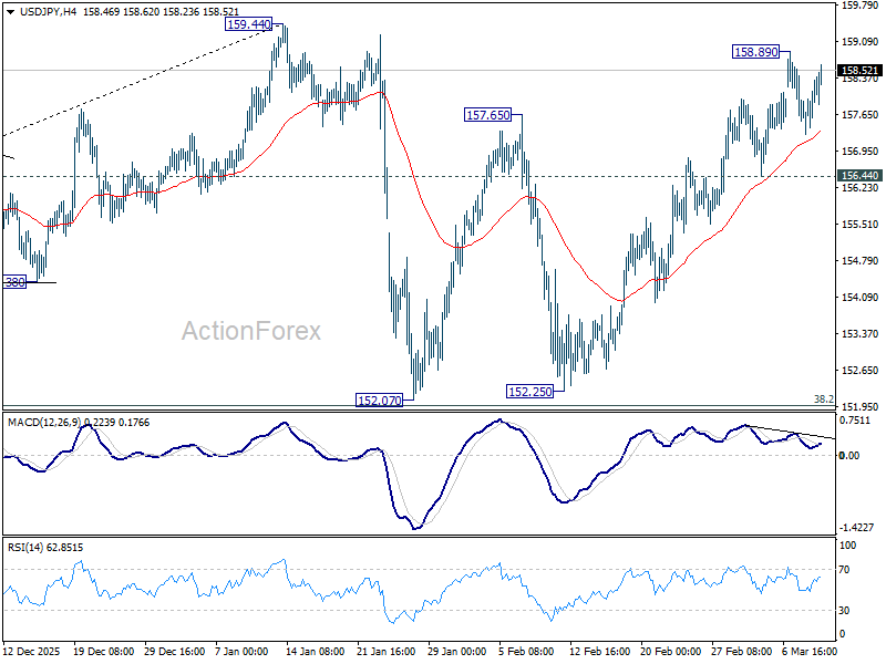 USD/JPY strengthens mildly in early US session but stays below 158.98 temporary top. Intraday bias remains neutral for the moment. On the upside, above 158.89 will extend the rise from 152.07 to 159.44 resistance. Decisive break there will target 161.94 high next. However, considering bearish divergence condition in 4H MACD, firm break of 156.44 support will argue that the rebound has completed, and turn bias back to the downside for 152.07 support. Overall, price actions from 159.44 are viewed as a near term consolidation pattern. Outlook will remain bullish as long as 38.2% retracement of 139.87 to 159.44 at 151.96 holds.