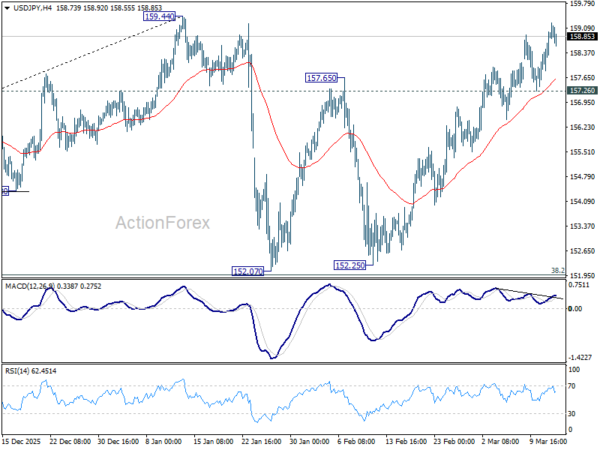 Intraday bias in USD/JPY remains on the upside as rise from 152.07 is still in progress. Firm break of 159.44 will target 161.94 high next. On the downside, below 157.26 support will turn intraday bias neutral again. Overall, price actions from 159.44 are viewed as a near term consolidation pattern. Outlook will remain bullish as long as 38.2% retracement of 139.87 to 159.44 at 151.96 holds.