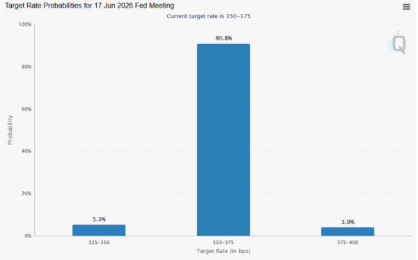Fed fund futures pricing reinforces this interpretation. Markets now assign over 90% probability that rates will remain unchanged at 3.50–3.75% through the first half of the year, with only a marginal chance of a hike. This reflects growing acceptance that the Fed is in no rush to ease policy.