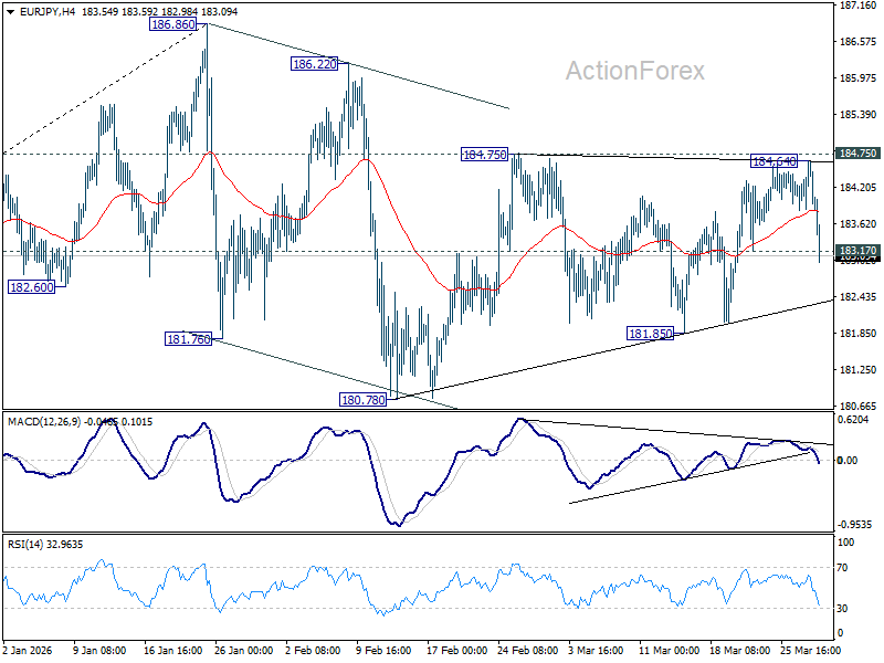EUR/JPY’s accelerated decline and break of 183.17 minor support should confirm rejection by 184.75 resistance. Intraday bias is back on the downside for 181.85 support. Firm break there will argue that the correction from 186.86 is already in the third leg, and should target 180.78 and below. For now, risk will be on the downside as long as 184.64 holds, in case of recovery.