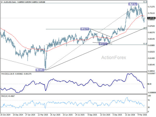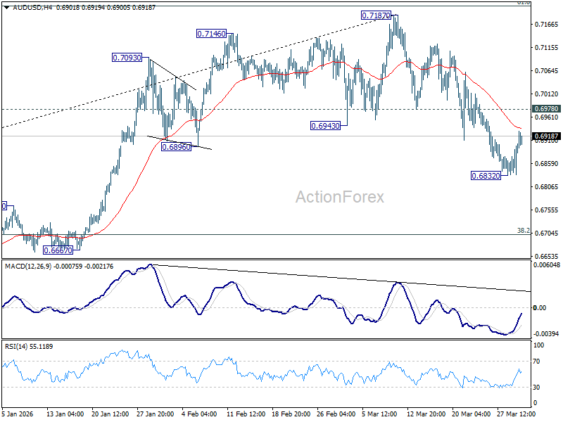 A temporary low should be in place at 0.6832 in AUD/USD with current recovery. Intraday bias is turned neutral first. Further decline is expected as long as 0.6978 support turned resistance. Below 0.6832 will extend the decline from 0.7187 to 38.2% retracement of 0.5913 to 0.7187 at 0.6700. However, firm break of 0.6978 will argue that the correction has completed, and bring retest of 0.7817 high.