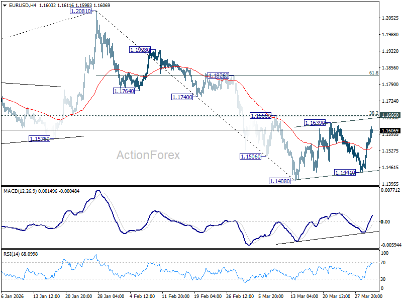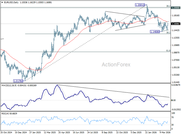 EUR/USD’s rebound from 1.1441 extended further, but still it’s capped below 1.1666 cluster resistance (38.2% retracement of 1.2081 to 1.1408 at 1.1665). Price actions from 1.1408 are viewed as a consolidations pattern and further decline is expected. On the downside, firm break of 1.1408 will resume the fall from 1.2081 to 38.2% retracement of 1.0176 to 1.2081 at 1.1353. However, decisive break of 1.1666 will argue that the fall from 1.2081 has completed, and turn bias back to the upside for 61.8% retracement of 1.2081 to 1.1408 at 1.1824.