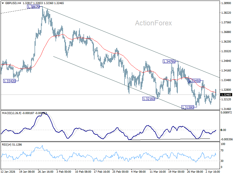 GBP/USD is still bounded in range trading and intraday bias remains neutral. With 1.3479 resistance intact, further decline is still in favor. Below 1.3158 will resume the fall from 1.3867 to 1.3008 structural support. However, firm break of 1.3479 will indicate that the fall from 1.3867 has completed, and turn bias back to the upside for stronger rally.