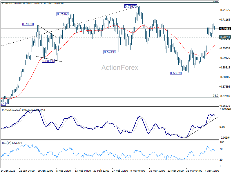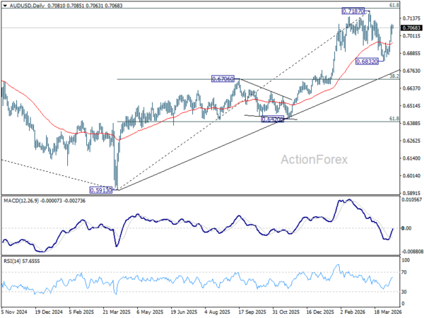 Intraday bias in AUD/USD remains mildly on the upside as rise from 0.6832 is in progress to retest 0.7187 high. Strong resistance could be seen there to bring another fall to extend the near term corrective pattern. On the downside, below 0.7021 minor support will turn intraday bias neutral again first.