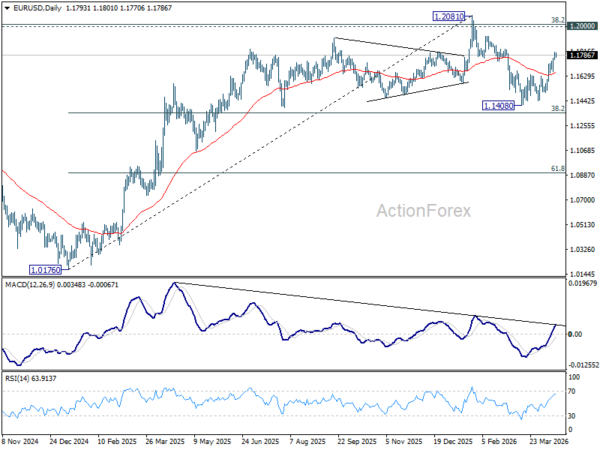 Intraday bias in EUR/USD stays mildly on the upside despite some loss of upward momentum. Decisive break of 61.8% retracement of 1.2081 to 1.1408 at 1.1824 will extend the rally from 1.1408 to retest 1.2081 high. On the downside, below 1.1739 minor support will turn intraday bias neutral first.