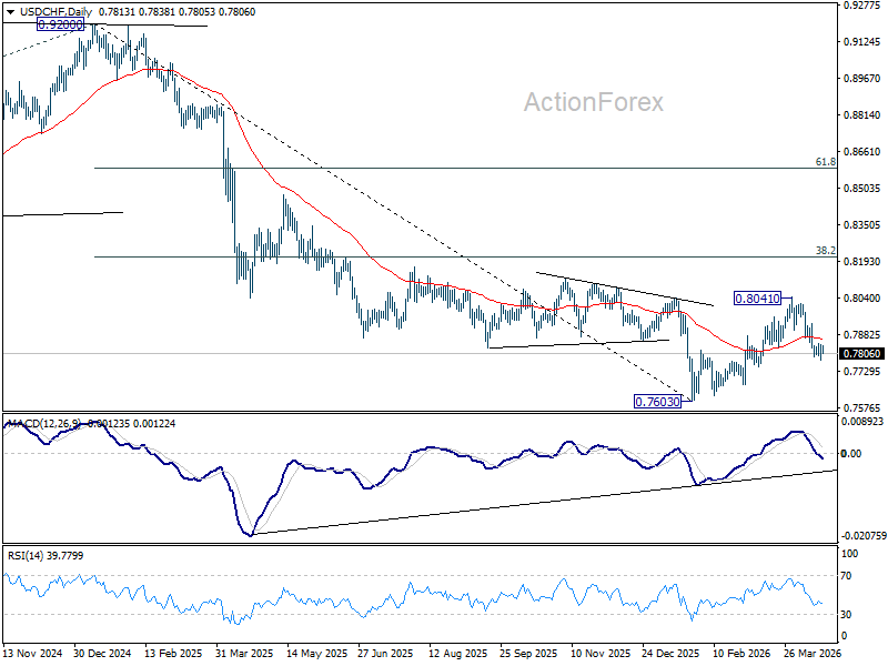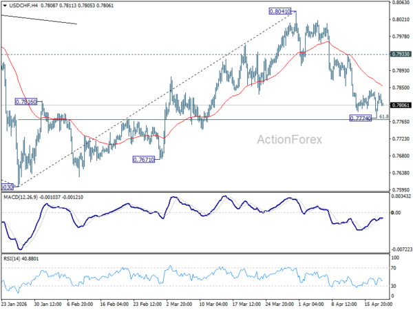 USD/CHF is staying consolidations above 0.7774 temporary low and intraday bias remains neutral. Upside of recovery should be limited below 0.7933 resistance to bring another fall. Sustained break of 61.8% retracement of 0.7603 to 0.8041 at 0.7770 will resume the decline from 0.8041 to retest 0.7603 low.
