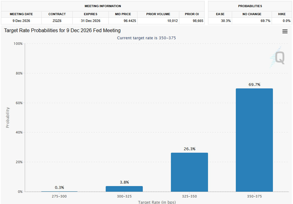 Market pricing reflects this outlook clearly. Fed funds futures are assigning virtually no probability to a rate hike this year, while indicating around a 30% chance of a cut by the end of the year.
