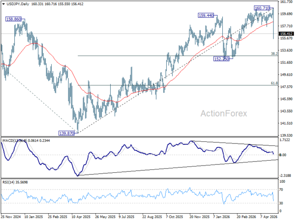 USD/JPY steep decline today suggests medium term topping at 160.71, on bearish divergence condition in D MACD. Deeper fall should be seen to 152.25 cluster support (38.2% retracement of 139.87 to 160.71 at 152.74). Strong support should emerge there to bring rebound, at least on first attempt. However, decisive break of 152.25/75 will confirm rejection by 161.94 high. That would pave the way back to 61.8% retracement at 147.83 next.