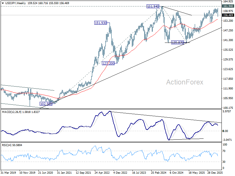 In the bigger picture, for now, corrective pattern from 161.94 (2024 high) is still seen as completed at 139.87. Rise from there is seen as resuming the long term up trend. So, break of 161.94 is expected at a later stage to resume the long term up trend. However, sustained break of 55 W EMA (now at 153.90) will dampen this view and bring deeper fall back towards 139.87 to extend the pattern from 161.94.