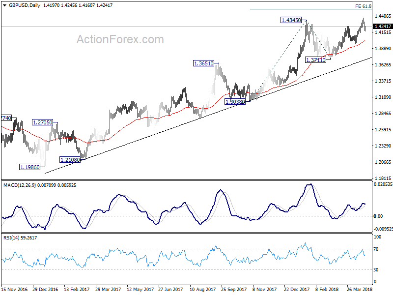 In the bigger picture, rise from 1.1946 (2016 low) is in progress and resuming. It is at least correcting the long term down trend from 2007 high at 2.1161. Further rally would be seen back to 38.2% retracement of 2.1161 (2007 high) to 1.1946 (2016 low) at 1.5466. We’d continue to favor this medium term bullish view as long as 1.3711 support holds, even in case of deep pull back.
