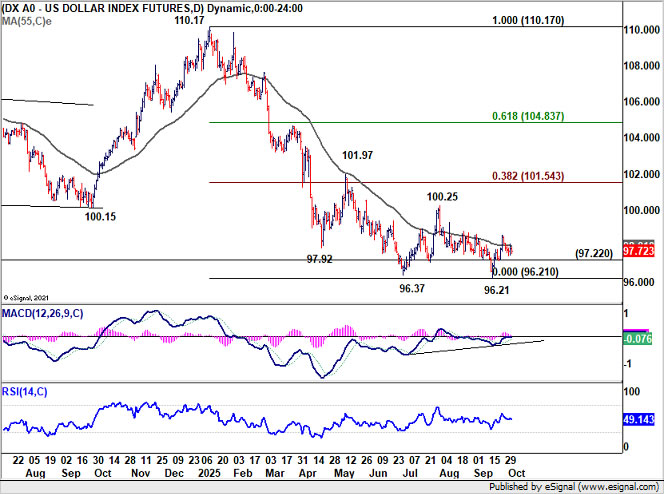 The greenback has softened in tandem with falling yields, as risk appetite improved and traders repositioned for faster Fed easing. Dollar Index’s rebound from 96.21 short term bottom lost momentum and closed back below 55 D EMA (now at 98.01).