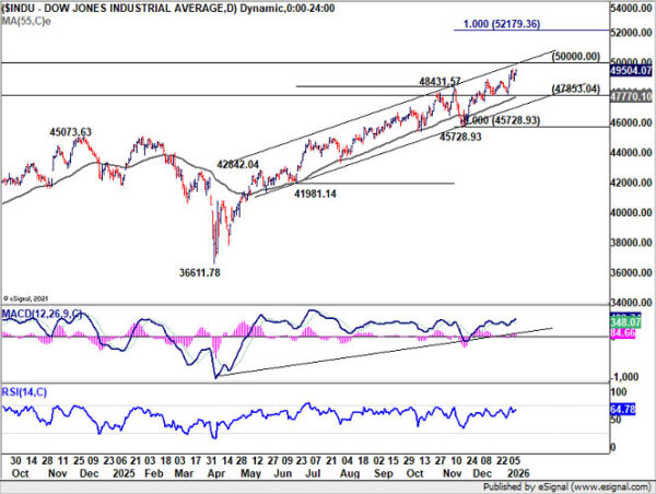 DOW extended its uptrend to fresh record highs last week, suggesting that risk appetite remained intact. As long as 47,853 support holds, near-term bias remains bullish, with attention on 50,000 psychological level, which coincide with medium term rising channel ceiling. Decisive break above that 50,000 zone would likely accelerate gains towards 100% projection of 41,981.14 to 48,431.57 from 45,728.93 at 52,179.36. Such development would cap momentum of any Dollar rally.