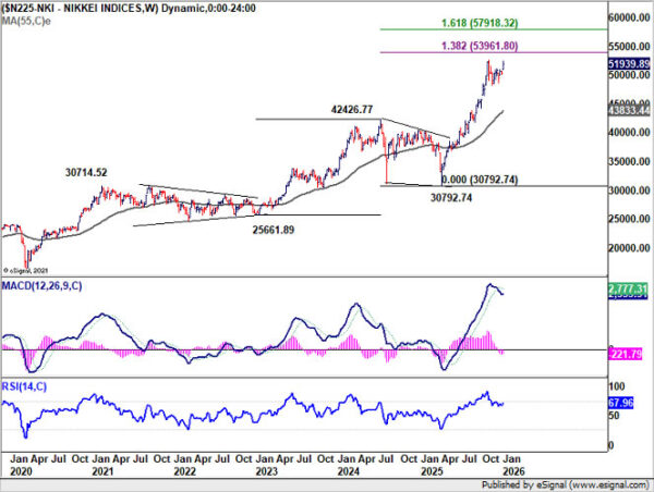 Technically, immediate attention now turns to whether Nikkei 225 can gap cleanly above 52,636.87 on Monday and sustain momentum. If it does, the next focus will be 138.2% projection of 25,661.89 to 42,426.77 from 30,792.74 at 53,961.80. Firm break there will pave the way to 161.8% projection at 57,918.32.