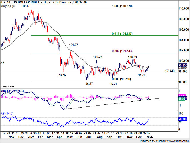 Technically, Dollar Index’s rebound extended with firm break of 55 D EMA (now at 98.75). That move suggests the pullback from 100.39 has completed at 97.74 as a correction. Further rally is now in favor back to 100.39 resistance, and possibly above.