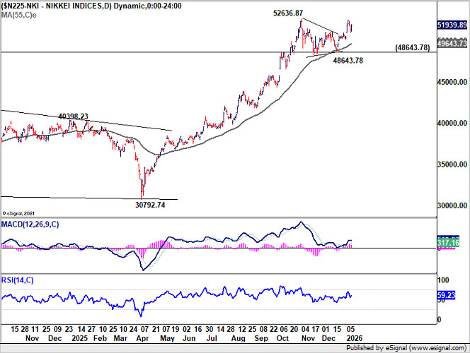 Technically, immediate attention now turns to whether Nikkei 225 can gap cleanly above 52,636.87 on Monday and sustain momentum. If it does, the next focus will be 138.2% projection of 25,661.89 to 42,426.77 from 30,792.74 at 53,961.80. Firm break there will pave the way to 161.8% projection at 57,918.32.