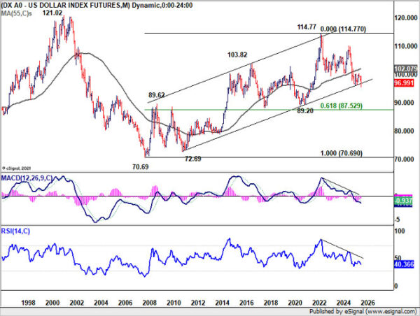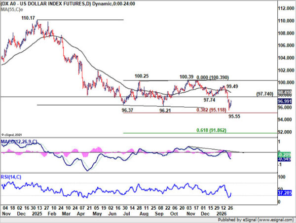 Technically, Dollar Index reflects this pressure. The break below 96.21 to 95.55 last week signaled renewed downside momentum. As long as 97.74 resistance holds, the long term down trend is seen as resuming.