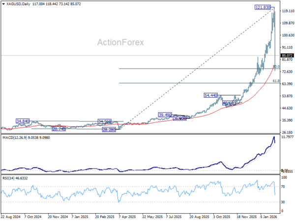 The most dramatic action unfolded in precious metals. Gold and Silver surged to fresh record highs, only to suffer violent reversals that erased weeks of gains in a matter of house. Gold briefly peaked near 5,598 before collapsing to close the week around 4882, a drawdown of more than 13% from the high. Silver’s reversal was even more brutal, plunging from a record 121.81 to 85.07, a decline of roughly 30%. These are classic signs of terminal momentum, not healthy consolidation.