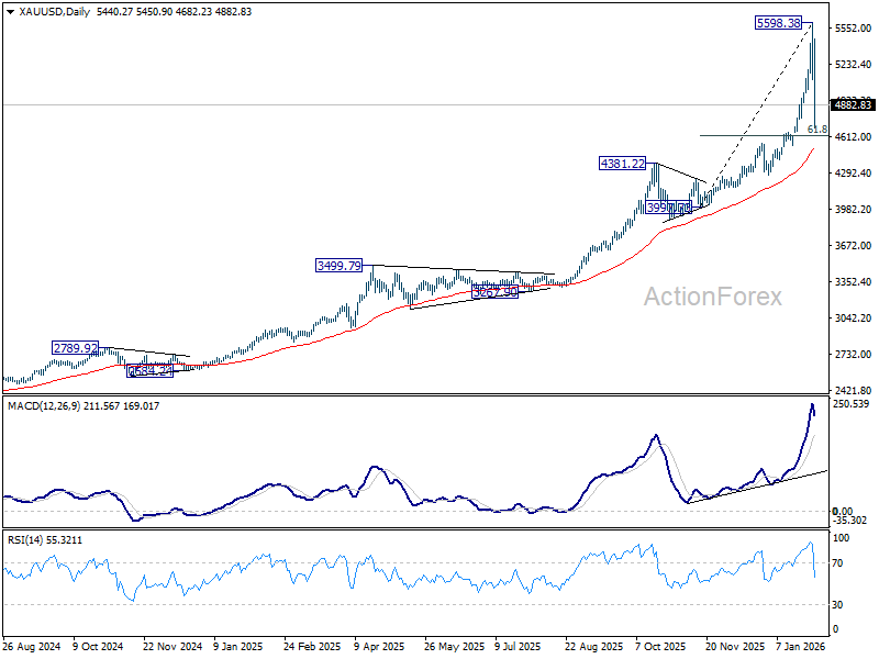 The most dramatic action unfolded in precious metals. Gold and Silver surged to fresh record highs, only to suffer violent reversals that erased weeks of gains in a matter of house. Gold briefly peaked near 5,598 before collapsing to close the week around 4882, a drawdown of more than 13% from the high. Silver’s reversal was even more brutal, plunging from a record 121.81 to 85.07, a decline of roughly 30%. These are classic signs of terminal momentum, not healthy consolidation.