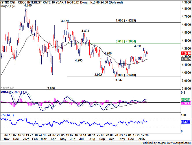 Treasury markets told a similar story of restraint. US 10-year yield continued to oscillate in a tight range above 4.200, after briefly spiking to 4.311 earlier in January. There was no sustained follow-through in either direction.