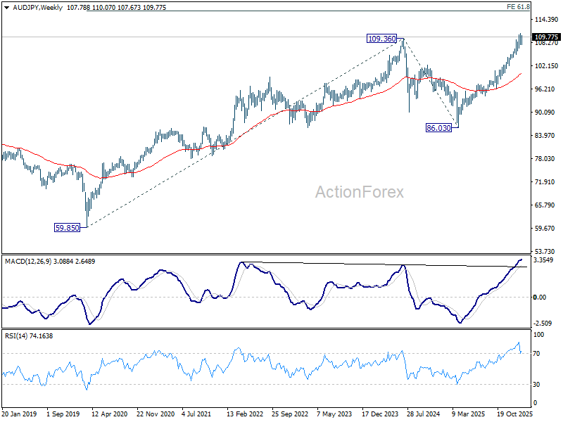 Technically, while more near-term consolidation below 110.78 cannot be ruled out, downside should be contained by 106.06 support, which sits near 55 D EMA (now at 106.23). As long as that floor holds, the broader uptrend remains intact, with the next medium-term target at 61.8% projection of 59.85 (2020 low) to 109.36 (2024 high) from 86.03 (2025 low) at 116.60. However, decisive break below 106.06 would send a very different signal — one of deteriorating risk sentiment – and drag AUD/JPY down for deeper correction.