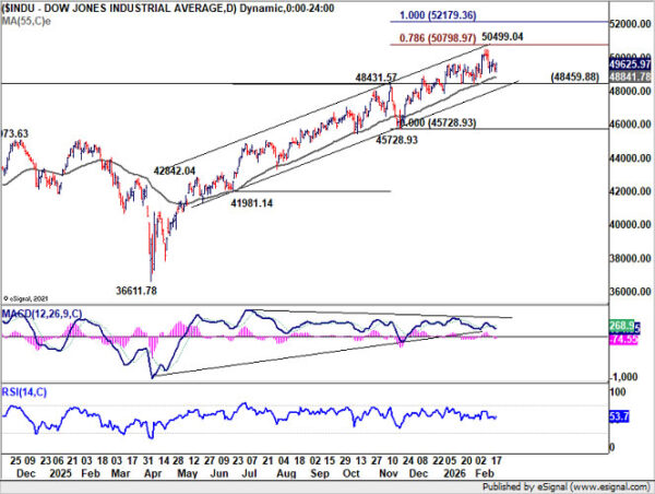 Technically, DOW continued to trade in tight range beneath 50,499.04 peak. The broader technical outlook remains bullish, with scope for another leg higher toward 78.6% projection of 41,981.14 to 48,431.57 from 45,728.93 at 50,798.97. Firm break there would confirm renewed upside momentum and open the door toward 100% projection at 52,179.36.