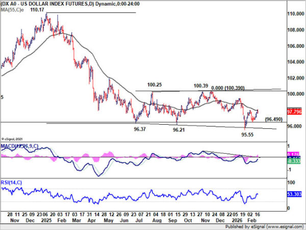 Dollar Index resumed its rebound from the 95.55 short-term low and briefly pushed above its 55 D EMA (now at 97.59). That technical break suggests short-term momentum has improved, but it does not yet alter the bigger picture.