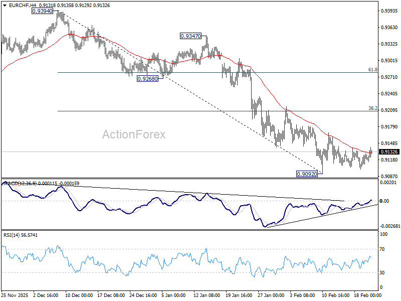 EUR/CHF stayed in range trading above 0.9092 low last week. Current development suggests that 0.9092 is already a short term bottom, and slightly lengthier consolidation is underway. Strong rebound might be seen to But upside should be limited by 38.2% retracement of 0.9394 to 0.9092 at 0.9207. On the downside, firm break of 0.9092 will resume larger down trend.