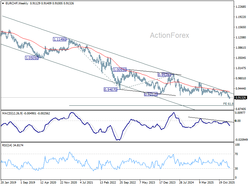 In the bigger picture, down trend from 0.9928 (2024 high) is still in progress with falling 55 W EMA (now at 0.9326) intact. Next target is 61.8% projection of 1.1149 to 0.9407 from 0.9928 at 0.8851. Outlook will stay bearish as long as 0.9394 resistance holds, in case of rebound.