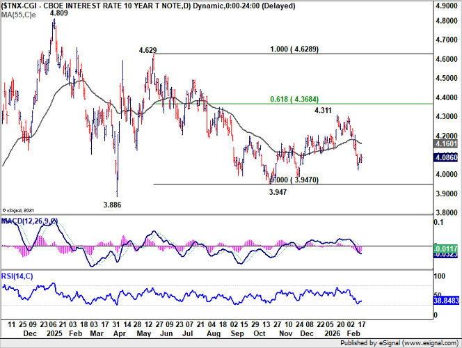 10-year yield recovered after dipping to 4.025, but quickly recovered. While further fall is expected as long as 55 D EMA (now at 4.160) holds, strong support could emerge between 3.947 (October low) and 4.000 psychological level to floor downside.
