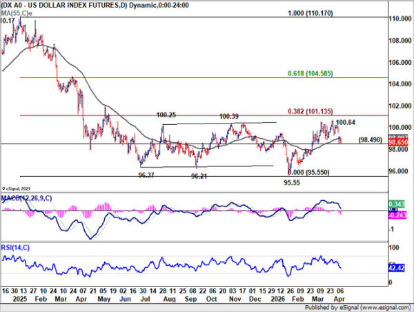 For Dollar Index, 98.65 support is now in focus following last week’s decline. Firm break below this level would suggest that the rebound from 95.55 has already topped at 100.64. The rejection near 38.2% retracement of 100.17 to 95.55 at 101.13, alongside the 55 W EMA (now at 99.62), keeps the medium-term outlook Bearish.