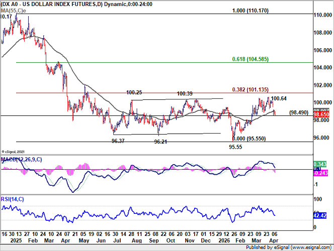 Should 98.65 give way, retest of the 95.55 low should be seen next. Decisive break below that level would confirm the resumption of the broader downtrend from the 114.77 (2022 high).