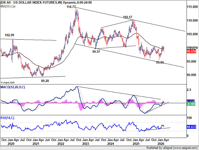 For Dollar Index, 98.65 support is now in focus following last week’s decline. Firm break below this level would suggest that the rebound from 95.55 has already topped at 100.64. The rejection near 38.2% retracement of 100.17 to 95.55 at 101.13, alongside the 55 W EMA (now at 99.62), keeps the medium-term outlook Bearish.