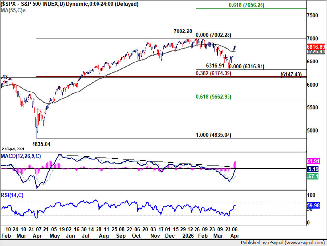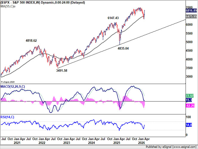 S&P 500’s strong rebound last week suggests that the corrective decline from 7,002.28 has likely completed at 6,316.91. Notably, firm support emerged from a key cluster zone, including 6,147.43 resistance-turned-support, 38.2% retracement of 4,835.04 to 7,002.28 at 6,174.39, and the 55 W EMA (now at 6,457.95). This confluence reinforces the view that the longer-term uptrend remains intact.