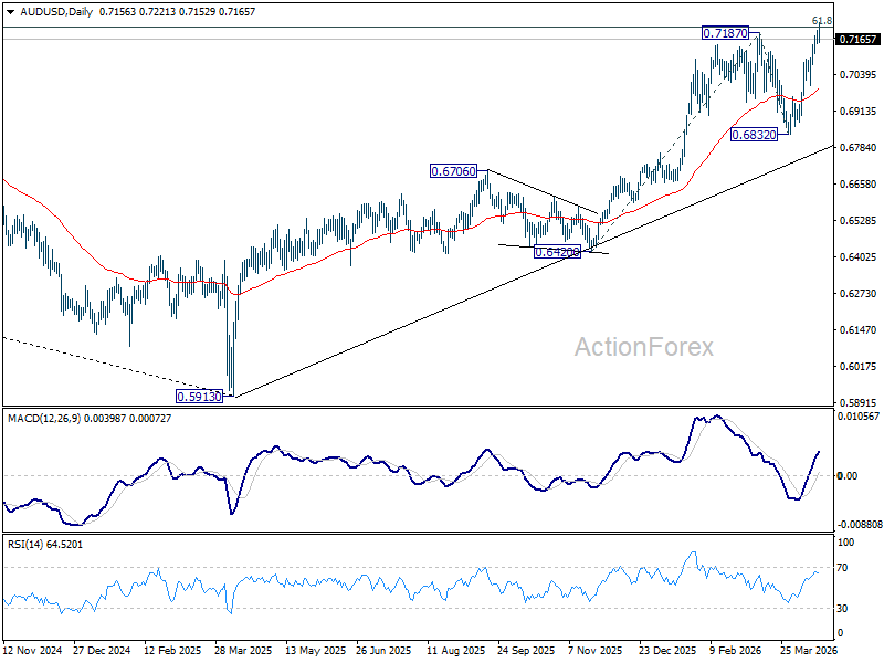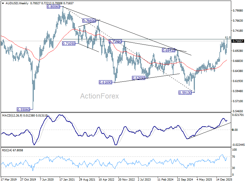 More importantly, decisive break of 61.8% retracement of 0.8006 to 0.5913 at 0.7206 will solidify the case that it’s reversing the down trend from 0.8006 (2021 high), rather than correcting it. That should pave the way to retest 0.8006 at least.