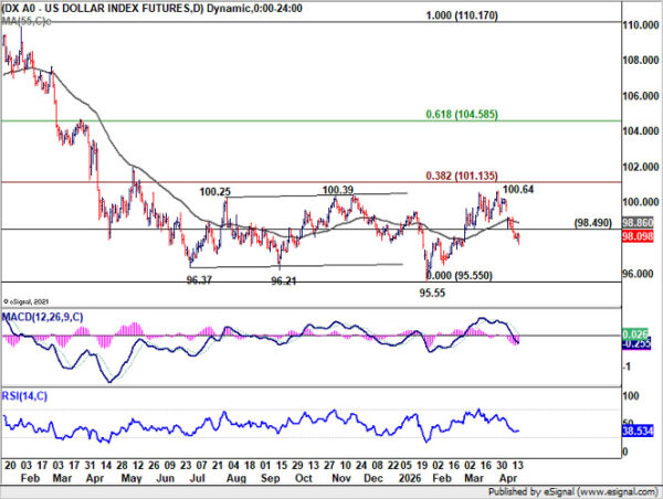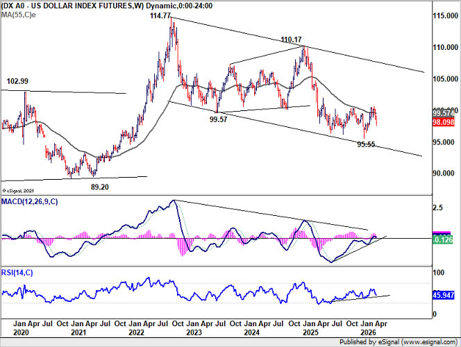 Dollar Index’s break below 98.49 support last week suggests that the rebound from 95.55 has already completed. More importantly, rejection below 38.2% retracement of 110.17 to 95.55 at 101.13, combined with failure at the 55 W EMA (now at 99.57), keeps the medium-term outlook bearish.